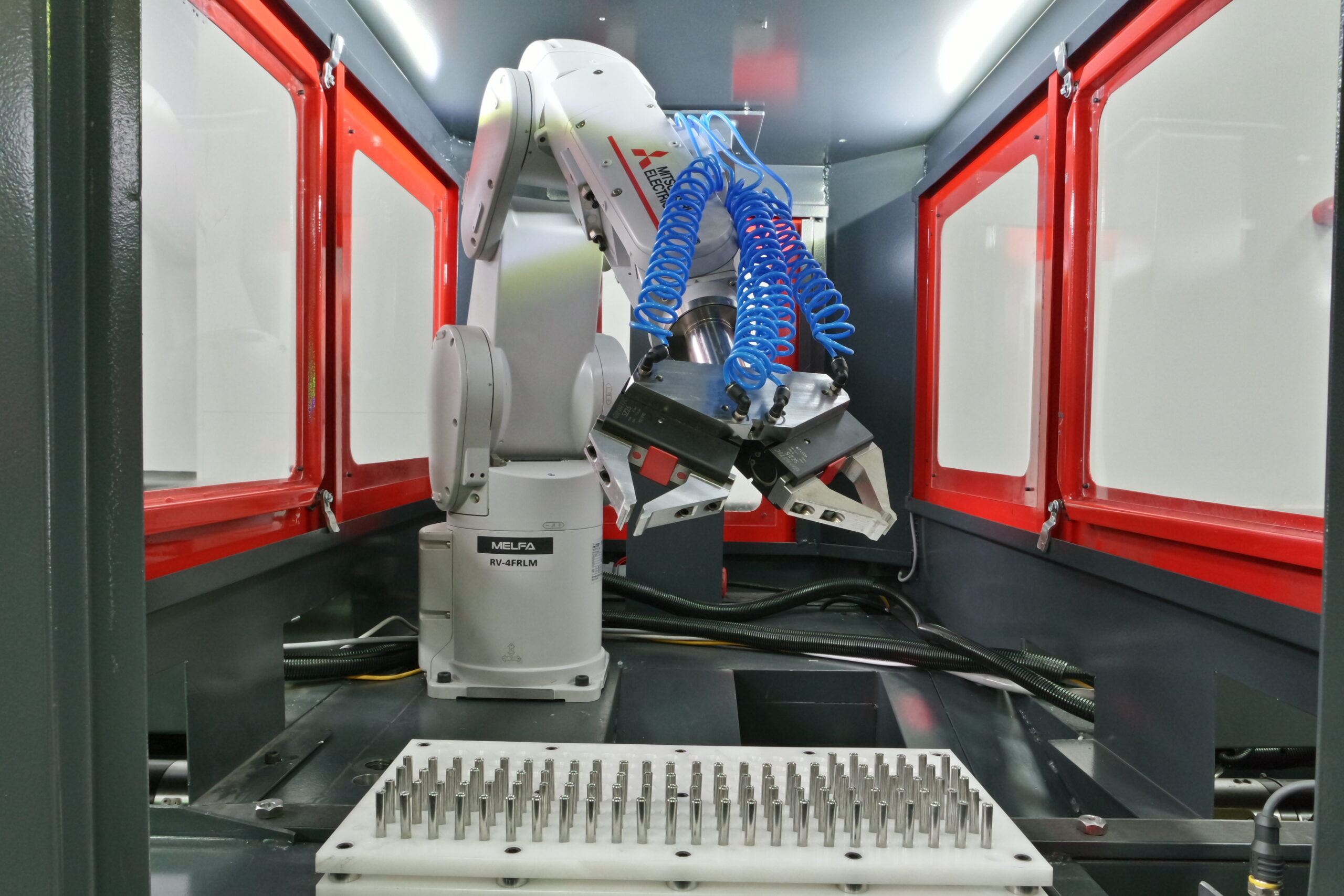 Kameralı Robotik Otomasyon: Vibrasyonlu hazne yardımıyla parçalar konveyör bandına bırakılır. Bu parçalar, fotoğraf çekimi için aydınlatma alanına getirilir. COGNEX endüstriyel kamera parçaların yüksek çözünürlüklü görüntülerini alır ve parçanın konum bilgisini robota iletir. Robot, bu bilgileri işleyerek parçayı makineye doğru pozisyonda yükler. Bu sistem sayesinde, farklı şekillerdeki parçaların yüklenmesi ve boşaltılması yalnızca yazılım üzerinden yapılabilir, sistem üzerinde fiziksel bir değişikliğe gerek kalmaz. Ayrıca kamera sayesinde kalite kontrol ölçümleri de yükleme sırasında yapılabilir. Şirketimiz tarafından geliştirilen özel silo sistemi sayesinde, insan müdahalesi olmadan sistem 8 saate kadar kesintisiz çalışabilir.